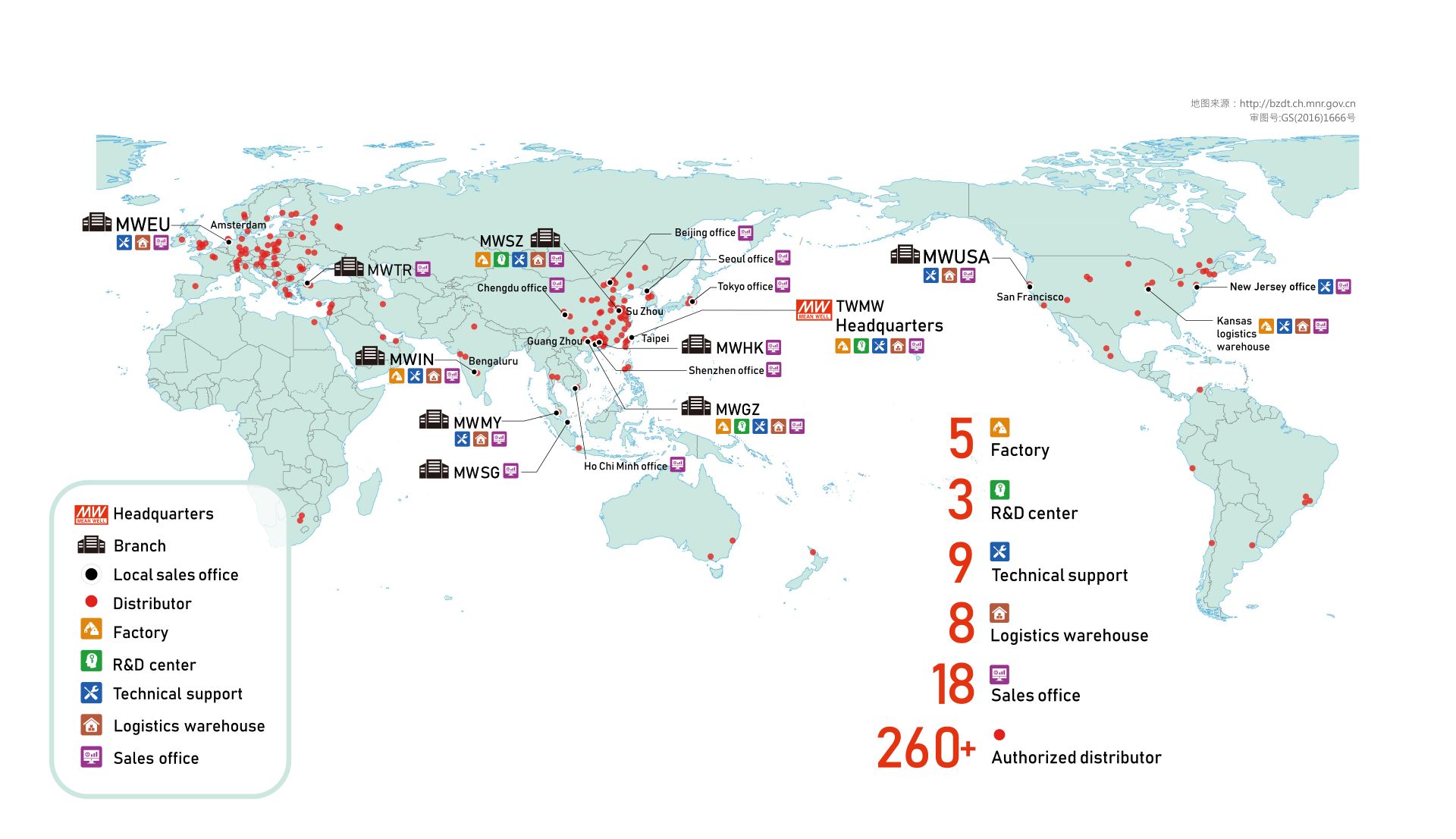 自創立以來,明緯即以「心懷善意」的精神,及「信賴伙伴」的信念持續與客戶、供應商、協力廠及員工保持長期的合作關系,我們藉由與全球260家以上授權經銷商建立的堅強伙伴關系,穩定地成長與茁壯,2024年已成為合并營收達10.22億美金 以上的專業電源品牌制造商,全球總部位于臺灣新北產業園區,在廣州、深圳、蘇州、美國(加州/密蘇里州/紐澤西州)、歐洲荷蘭、印度、新加坡、香港、馬來西亞以及土耳其皆設有分公司及辦事處,全球員工人數達2500人。目前擁有5座生產基地,分別位于臺灣地區新北市、廣州花都區、蘇州市相城區、印度邦加羅爾以及美國堪薩斯城。