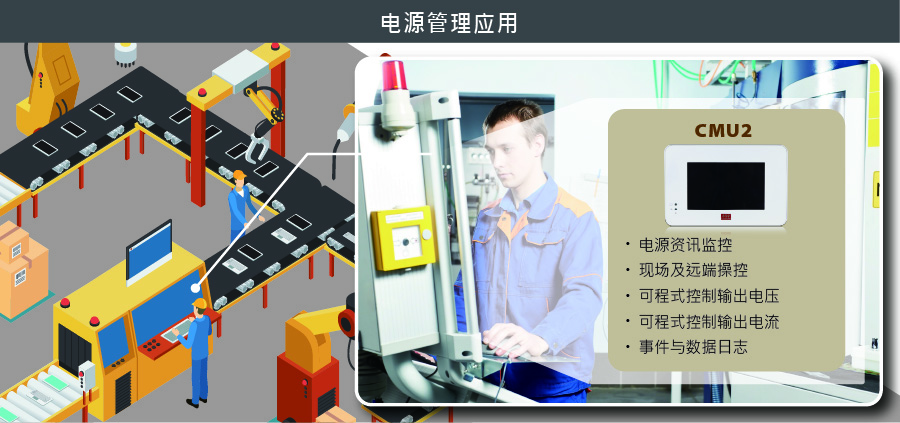 此外,為了方便使用者安裝于各場合,CMU2有兩種型態可選購,分別為獨立型與機柜型。針對不同應用有內建不同韌體與軟件,例如用于電源管理時所需的電壓電流調整,功率監控、日志,或是使用在燒機設備時所需的燒機時間,負載設定…等,讓使用者可快速地透過明緯最新設計的人機接口,進行系統的監視與控制。而為協助終端用戶達成智能工廠與工業自動化,CMU2除了配有觸控面板之外,更個別支持PMBus、CANBus或Modbus TCP通訊協議,讓管理者可透過有線或無線連網方式,達成近、遠程操作。