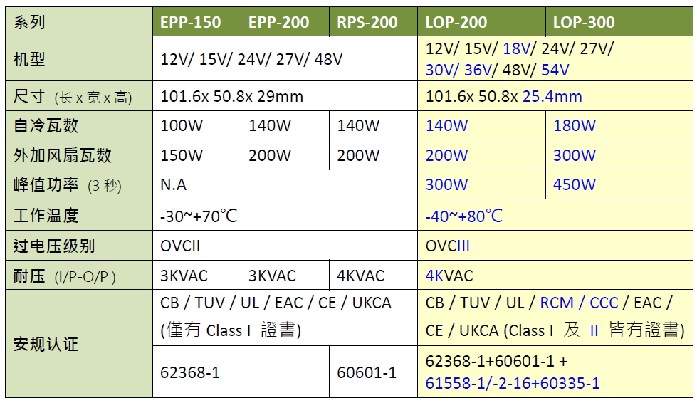 LOP-200/300 系列相較于銷售中 EPP-150/200、RPS-200 系列,主要差異詳如下表,包含薄型化 (1" 高)、12~54V 電壓更齊全、4" x 2" 尺寸下功率推升至 300W、具備 150%@3秒 供載能力、-40~+80℃ 工作溫度更寬、符合 OVCIII、一機(jī)同時擁有 62368-1/60601-1/61558-1/60335-1 各種安規(guī)認(rèn)證,可涵蓋應(yīng)用領(lǐng)域更廣,適用于資通訊電子儀器、醫(yī)療裝置、工廠自動化、家用裝置……等應(yīng)用。