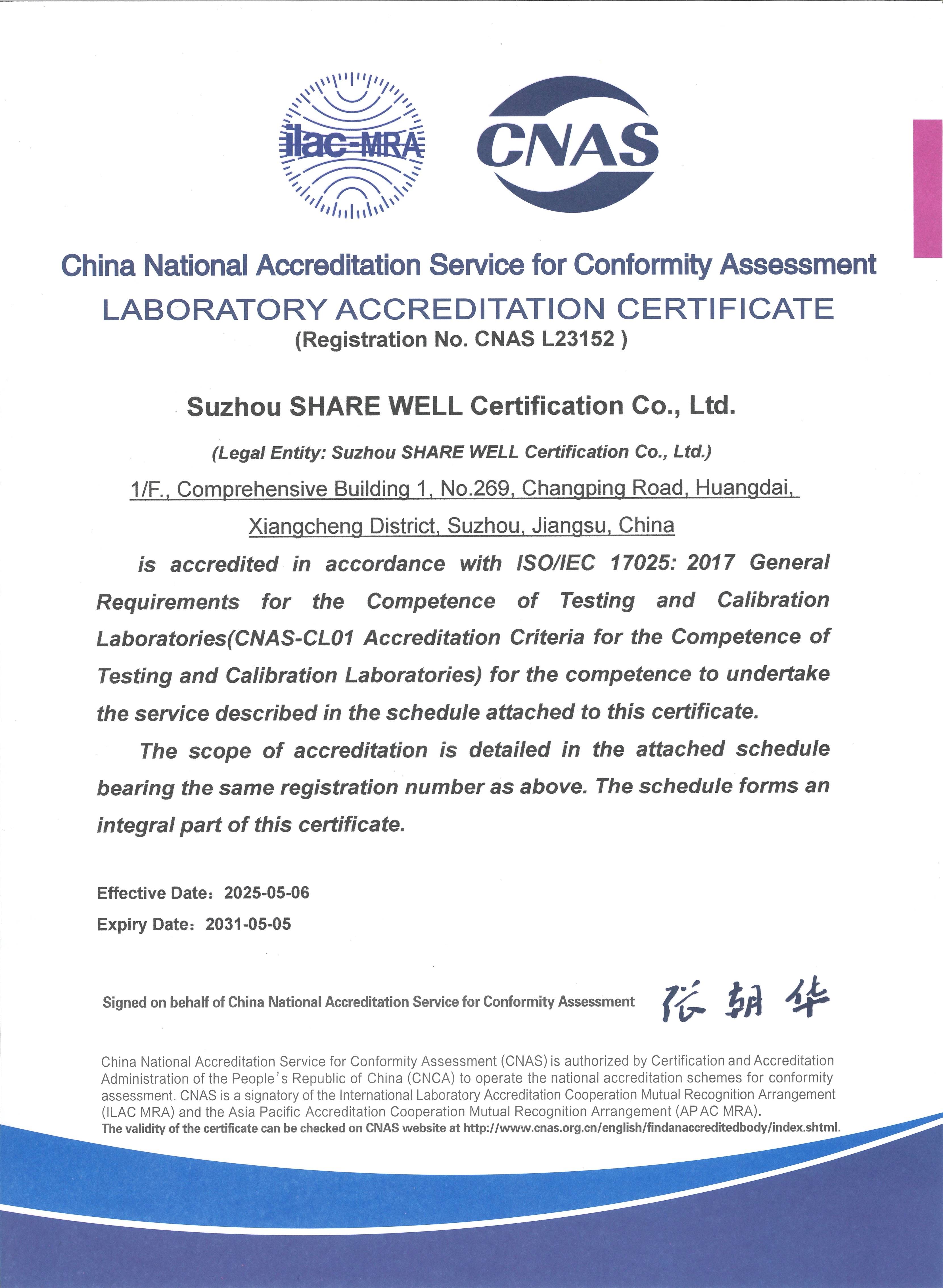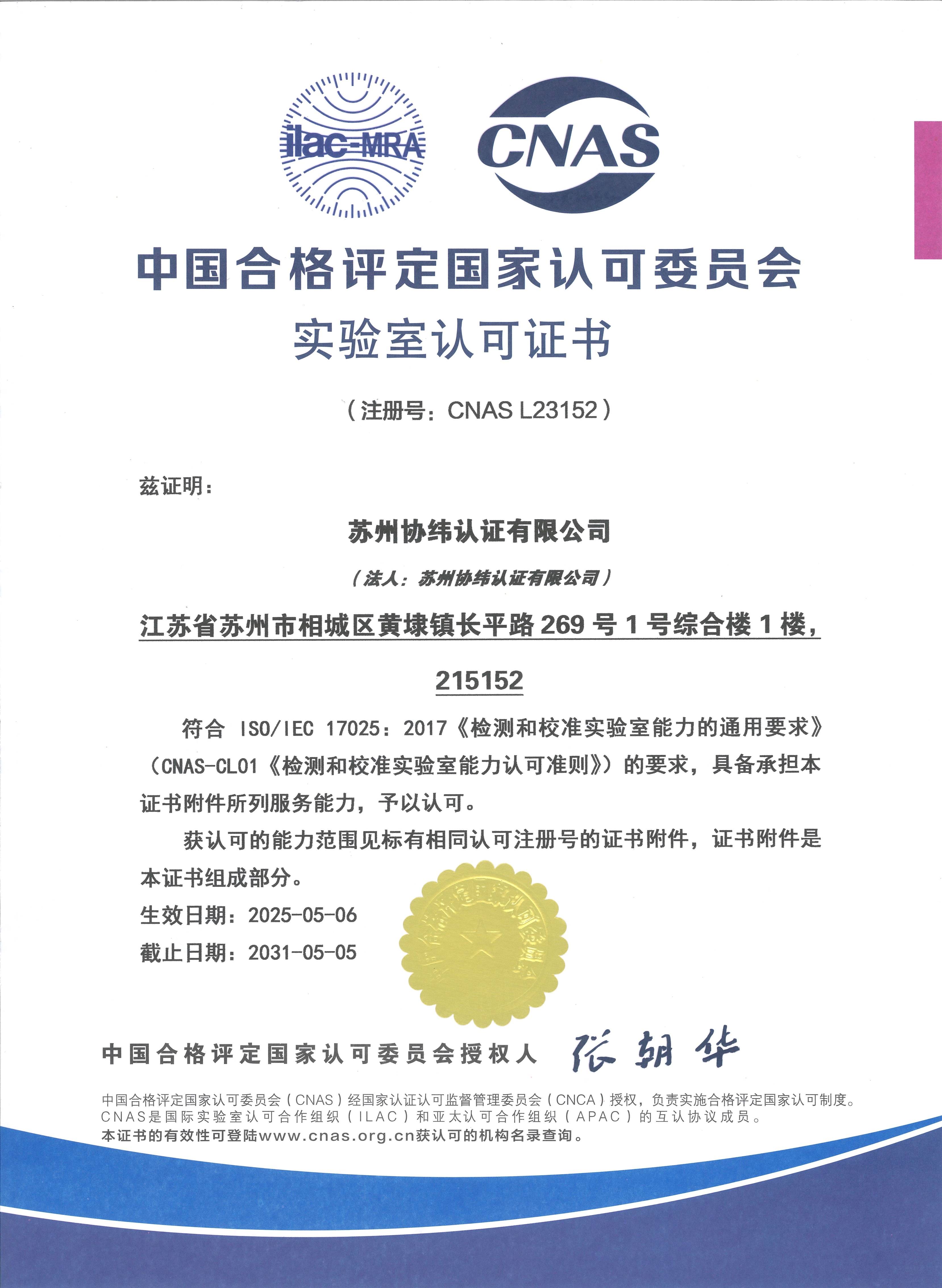 2025年5月6日蘇州協(xié)緯認(rèn)證有限公司正式獲得中國(guó)合格評(píng)定國(guó)家認(rèn)可委員會(huì)(CNAS)頒發(fā)的實(shí)驗(yàn)室認(rèn)可證書(注冊(cè)號(hào):CNAS L23152)。這標(biāo)志著該實(shí)驗(yàn)室在電磁兼容檢測(cè)領(lǐng)域的技術(shù)能力和質(zhì)量管理體系已達(dá)到國(guó)際水平。