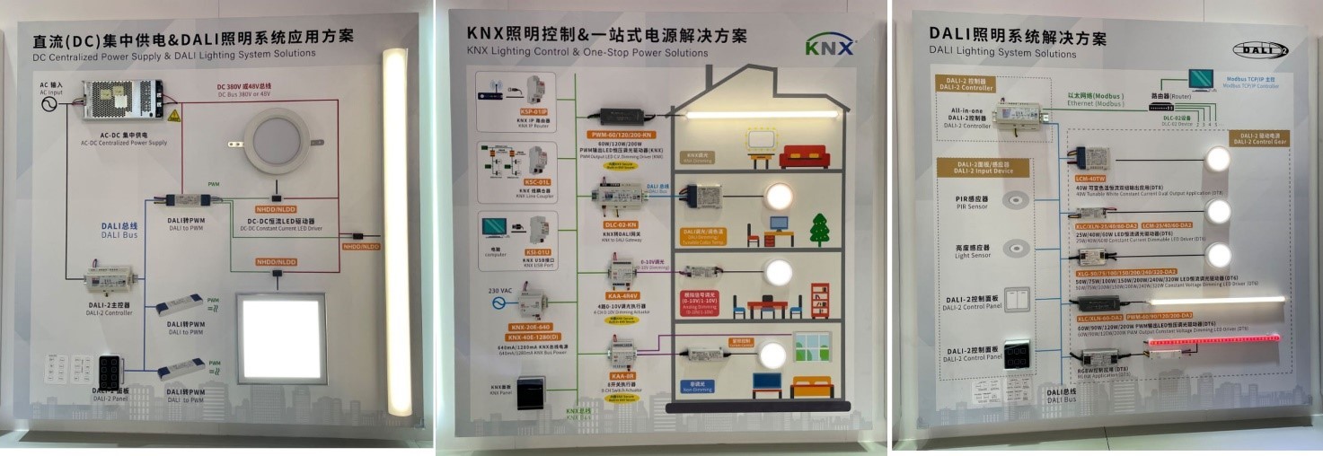 明緯展示完整KNX及DALI智能照明體驗區,提供數字調光解決方案,可讓照明變得更智能并結合健康照明,提供使用者更多不同的照明情境設定。此外,采用直流集中供電(380V or 48V DC)照明的轉換效率高于交流電,能夠降低電力轉換損耗,還可以減少電源供應器使用的零件數量,并可與未來綠能發電和儲能系統相結合,為企業提供節能減碳、友善環境的解決方案。