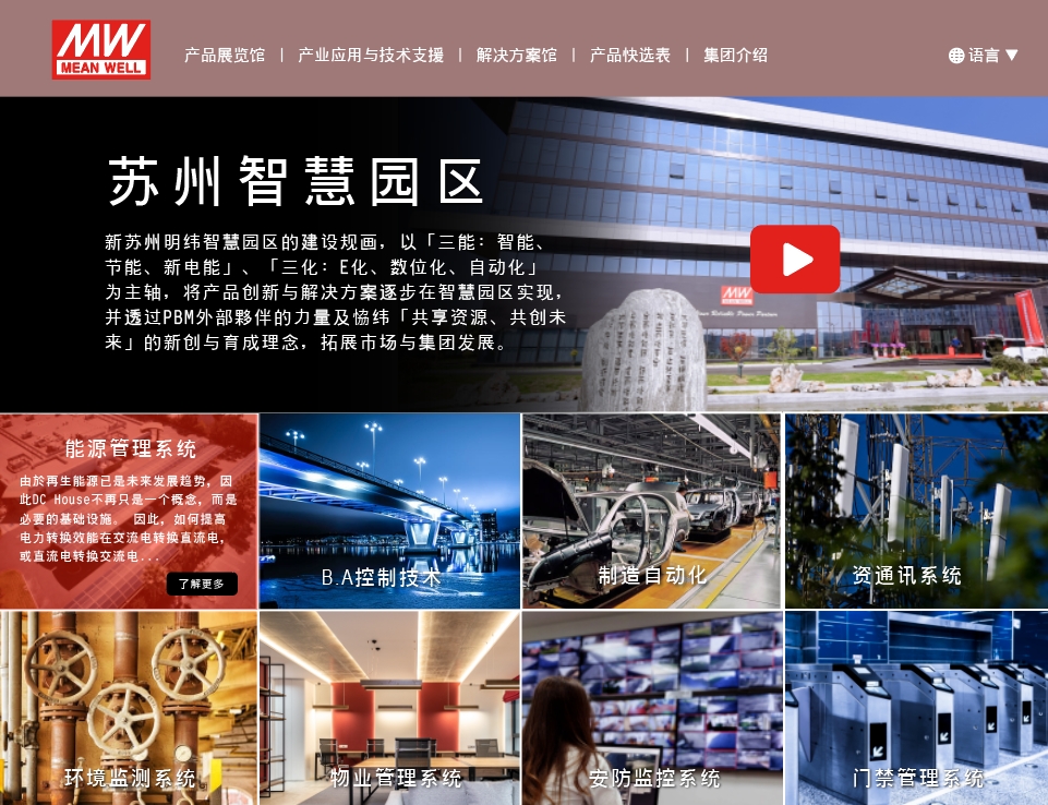 甫于2022/11/10全新開幕啟用的蘇州明緯智能園區,以明緯集團推廣「三能:智能、節能、新電能」、「三化:E化、數字化、自動化」為主軸,實現產品創新與解決方案的應用園區。誠摯的邀請您參觀園區內的八大系統科技應用,您將了解標準電源于各產業應用息息相關的明緯,所提供各式豐富的解決方案。