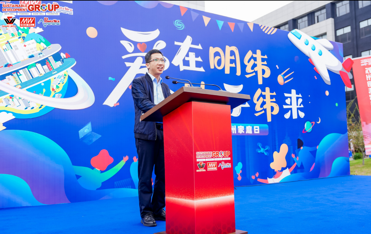 我們的大家長,SDG集團創辦人林國棟先生作開幕致詞。他表示,2006年生產的第一臺 MEAN WELL Power Supply代表著未來上億臺Power Supply。最初跟著公司發展的20位同仁也已深扎明緯,明緯的二代也在逐漸步入明緯,持續發揮著永續發展的力量!