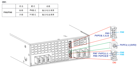 其輸出電壓電流的數值可藉由PV/PC功能來設定。此系列的PV/PC功能只能擇一使用,其選擇方式是藉由CN1的 PIN5/PIN6 開路或短路來決定;若是短路,則是選擇PV模式,可以調整輸出電壓;若是開路,則是選擇PC模式,可以調整輸出電流。