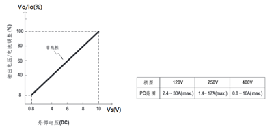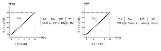 在PV模式下,有三種可以調整Vo的方式,第一種方式是藉由SVR2調整,其調整范圍為額定電壓的20~100%。第二種方式是在CN2的PIN7/PIN8之間外加一直流電壓訊號Vs,其調整范圍為額定電壓的20~100%,請參考圖六所示;若Vs<2V,則Vo≧額定電壓的10%。第三種方式是在CN2的PIN5/PIN6之間外加一直流電壓訊號Vs,其調整范圍為額定電壓的8~100%,請參考圖八所示,范圍較寬,且響應速度較快。