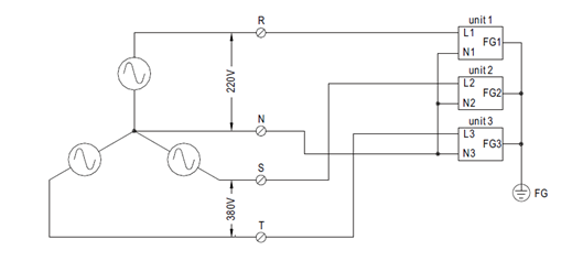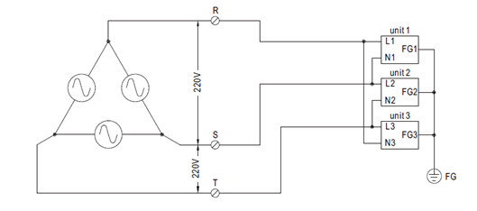 若三相平衡問(wèn)題不是主要議題或客戶可以搭配其他系統(tǒng)負(fù)載讓三相電源達(dá)到平衡,客戶也可以任取兩相線電壓直接接到單相交流電源輸入的產(chǎn)品,如圖六~圖八中VR-S / VS-T / VT-S對(duì)單一臺(tái)Unit的L / N配線;但需確認(rèn)其交流電壓值須介于產(chǎn)品的輸入電壓范圍。在實(shí)務(wù)上,終端客戶若搞不清楚其電力系統(tǒng)到底是屬于哪一種?則可以直接拿數(shù)字三用電表量測(cè)任兩條線的電壓值,只要介于產(chǎn)品的輸入電壓范圍即可。