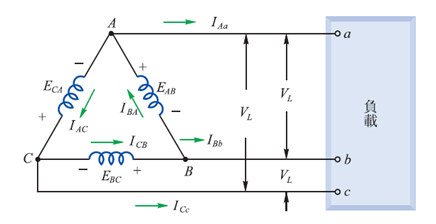 三相交流電源是由三個(gè)頻率相同、電勢(shì)振幅相等、相位差互差120?的交流電所組成的電力系統(tǒng),如圖二所示;由有三個(gè)繞組的三相發(fā)電機(jī)產(chǎn)生,是工業(yè)上常用的電源。為保證發(fā)電機(jī)的穩(wěn)定運(yùn)行,發(fā)電機(jī)至少需要三個(gè)繞組。理論上發(fā)電的相數(shù)可以更高,但三相電源最符合經(jīng)濟(jì)效益,因此世界各國(guó)普遍使用三相發(fā)電、供電。