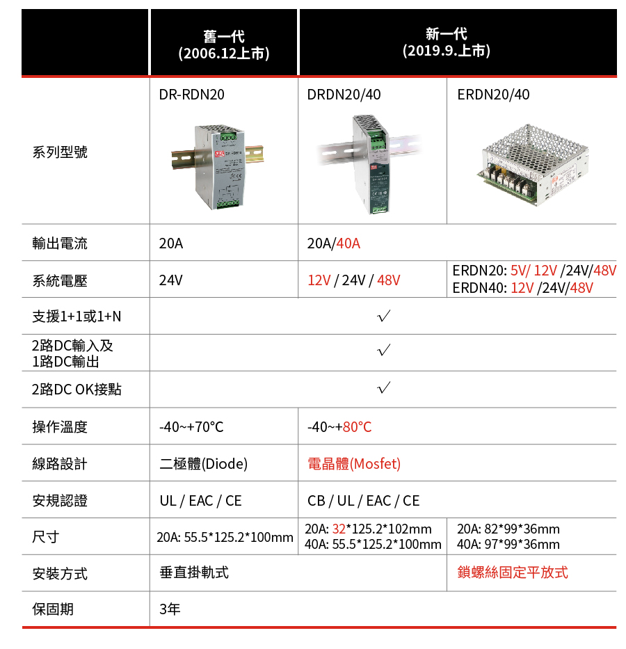 因為冗余產品需求越來越多,舊款冗余模塊的體積與效能無法滿足需求,明緯新開發了次世代軌道型可快速掛軌的DRDN20/40系列,并同時規劃了采鎖螺絲固定的機殼型ERDN20/40系列,新舊世代詳細差異如圖三所示。