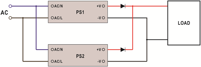 傳統(tǒng)冗余電源接法是由2個或多個電源于正端分別串接二極管的方式并聯(lián)輸出至電源總線上,如圖二所示。可以讓1個電源單獨工作,也可以讓多個電源同時工作。當(dāng)其中1個電源出現(xiàn)故障時,由于二極管的單向?qū)ㄌ匦裕粫绊戨娫纯偩€的輸出。