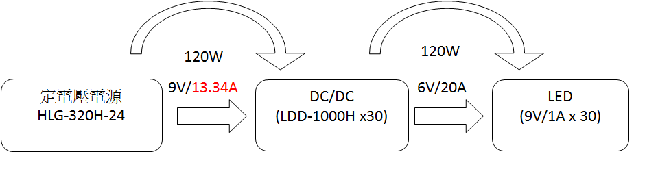 主因?yàn)殡娏鬓D(zhuǎn)換器啟動電壓低于前端電源供應(yīng)器的額定電壓,當(dāng)在低壓啟動工作下,電流轉(zhuǎn)換器需求電流高于電源可輸出電流值。以圖三為例,輸出端燈條每條上的LED電壓電流是9V/1A,30條并聯(lián)時(shí)總輸出就是270W。如果燈具或轉(zhuǎn)換器輸入電壓標(biāo)示為 24V 輸入,一般人可能會選 24V、大于300W的LED驅(qū)動器,比如說HLG-320H-24。