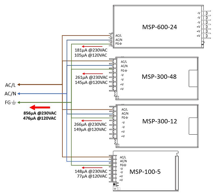 圖1顯示了明緯單臺模塊電源產品 NMP1K2-HHEKC#-01的漏電流測試結果,該機型由24V,12V,48V和5V四個輸出模塊組成。圖2顯示了使用四臺單輸出電源時的總漏電流,四臺機型分別為MSP-600-24、MSP-300-12、MSP-300-48與MSP-100-5。