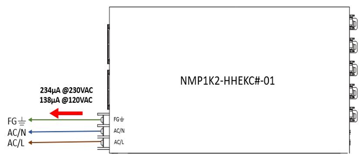 圖1顯示了明緯單臺模塊電源產品 NMP1K2-HHEKC#-01的漏電流測試結果,該機型由24V,12V,48V和5V四個輸出模塊組成。