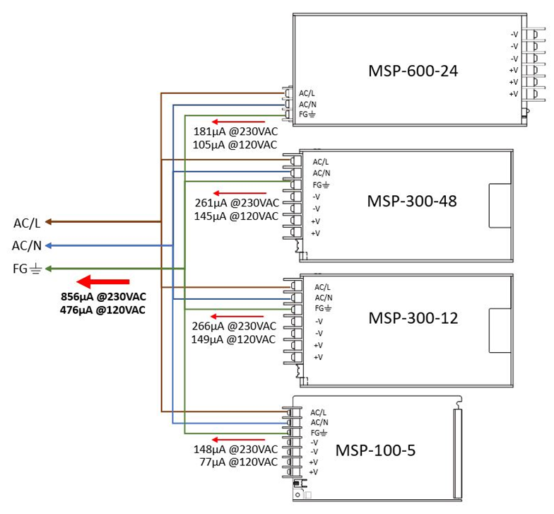 圖2顯示了使用四臺單輸出電源時的總漏電流,四臺機型分別為MSP-600-24、MSP-300-12、MSP-300-48與MSP-100-5。