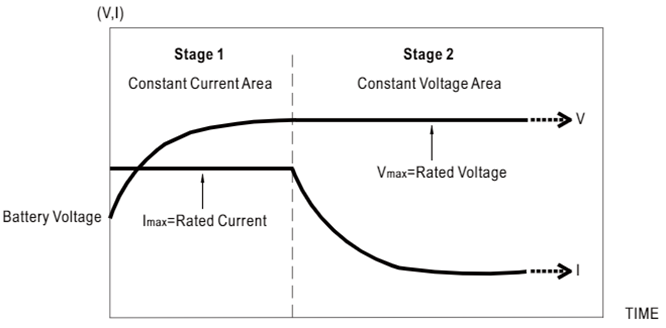 單一的鋰電池額定電壓可在3.2 V 到4.4V之間。最大充電電流可達1C。需注意不同廠商生產的相同化學成分鋰電池也往往有不同的額定電壓及電流。客戶需根據電池規格為準。與鉛酸電池不同,鋰電池不接受高于自身額定電壓的充電壓且自放電速率極低。因此鋰電池常選用無浮充模式的二段式充電(圖二)