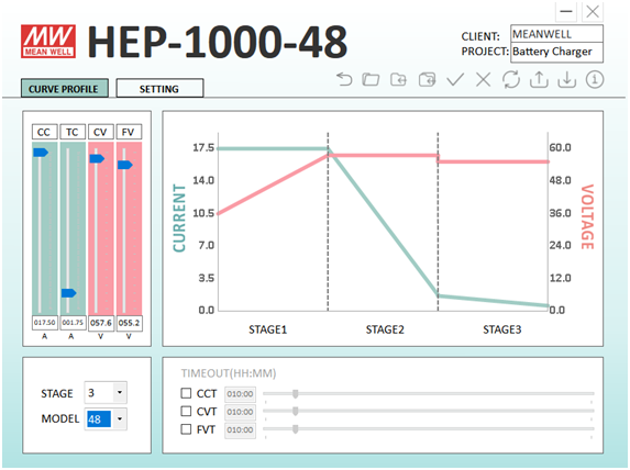 同前文所述,不同化學成分的電池,甚至不同的生產廠商所生產的相同成分之電池皆有不同的特性,為確保電池的可靠性、持久性與安全性,充電器的充電曲線需要搭配相對應的電池特性。明緯可程序設計充電器可搭配程序編輯器SBP-001提供彈性的解決方案,以應對不同電池的充電曲線要求。