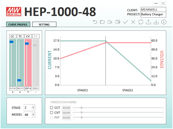 用戶只需要在軟件中選擇二段式充電模式,HEP-1000-48便可用于鋰電池充電,可調整的電壓及電流范圍不變。例如給一顆20Ah,最大充電電壓為56V的磷酸鋰鐵電池充電,使用者可將圖四所示的‘CV’及‘CC’選項調至56V及17.5A。如此可得到最快速的充電方案。使用者也可以選擇較低的恒流點避免高電流導致的高溫和較低的恒壓點以保證不會過度充電。