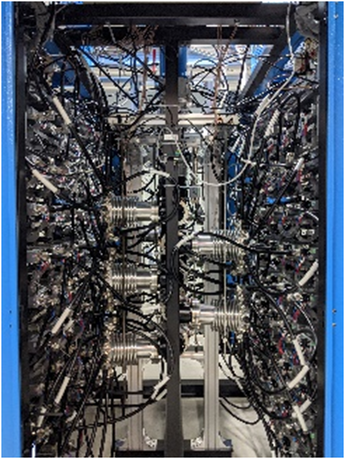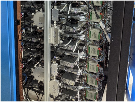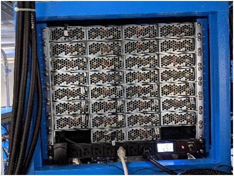 該標案規(guī)劃使用多套96kW之高功率電源系統(tǒng)(圖三),使用電源系統(tǒng)輸出的電力驅動全固態(tài)射頻功率放大器(Radio Frequency Power Amplifier)叢集(圖四)產(chǎn)生高頻能量,匯集高頻能量供應電子于趨近光速運行所需之能量(圖五),全部電源系統(tǒng)最大輸出直流功率將近800kW !
