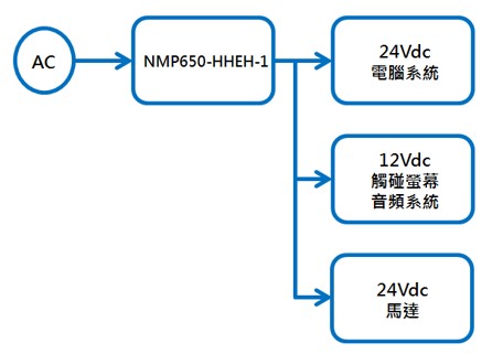 下圖為機場自助登機臺的設備,內部使用一臺模塊電源NMP650-HHEH-1,其中SLOT1/2為24Vdc并聯供電給內部搭載的計算機系統,SLOT3為12Vdc供電給觸碰屏幕與音頻系統,SLOT4為24Vdc供電給馬達。