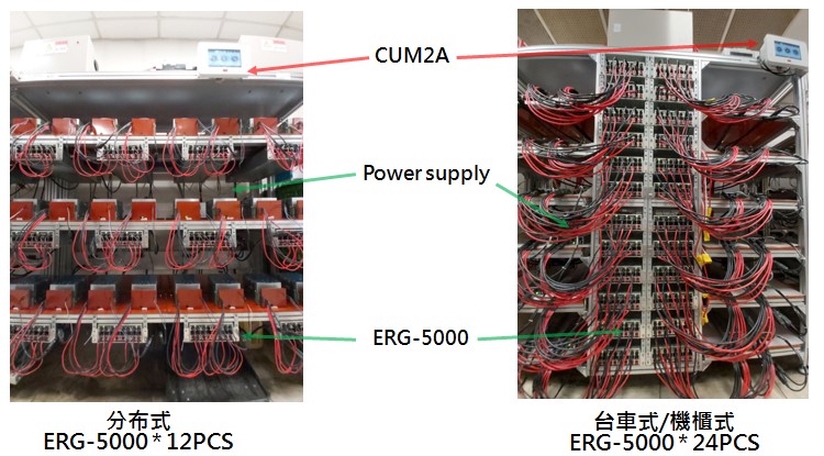 圖二是針對明緯不同的電源產品設計的燒機架,左邊分布式燒機架適用小于5000W的電源產品;右邊臺車式燒機架適用大于5000W的電源產品。
