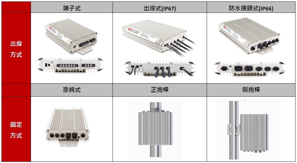 HEP-2300系列包含四種不同輸出電壓55V/115V/230V及380V,適用于高粉塵或室內外儀器設備,輸出電壓可透過三種方式調整,包含內建可變電阻方式、透過可程序化(PV/PC)功能,亦可透過數字通訊如CANBus/PMBus/MODbus等,對輸出電壓及電流做調整,方便結合人機接口做系統整合與控制使用。HEP-2300系列除提供不同的輸出電壓,亦提供三種接線方式,包含傳統端子式、防水出線式及防水接頭式;同時也提供不同固定方式如掛鉤式,正抱桿或側抱桿等方式。