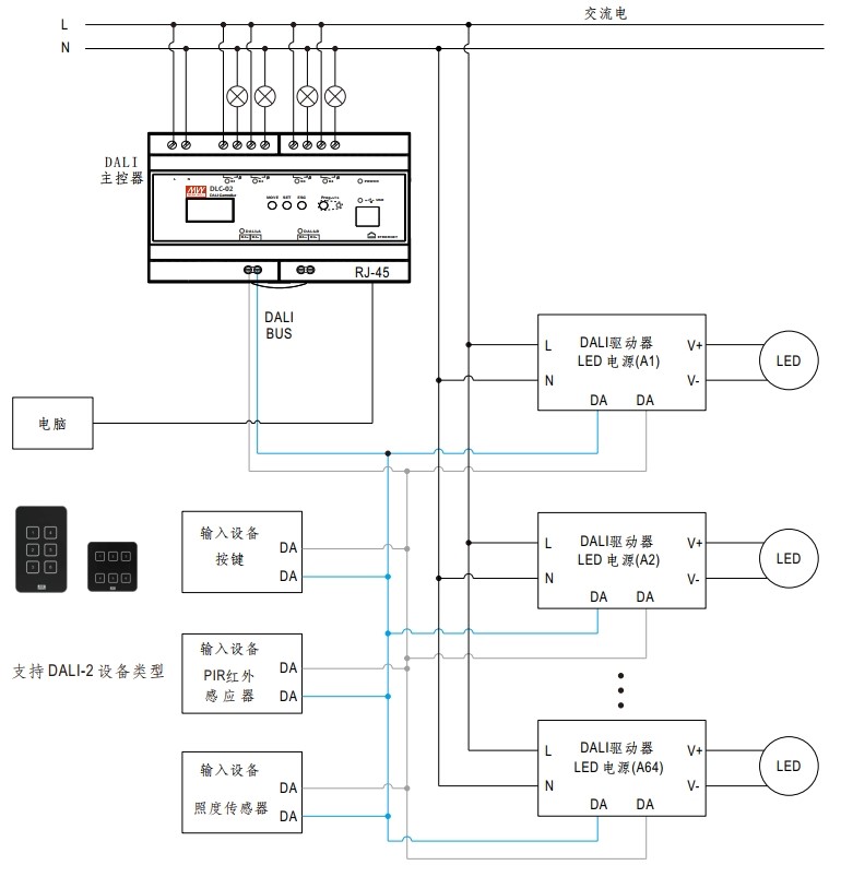 DTP-2XX系列觸控面板可與明緯DALI-2主控器DLC-02配合使用,構建完整的DALI-2智能照明系統,實現更全面、智能的照明控制。
