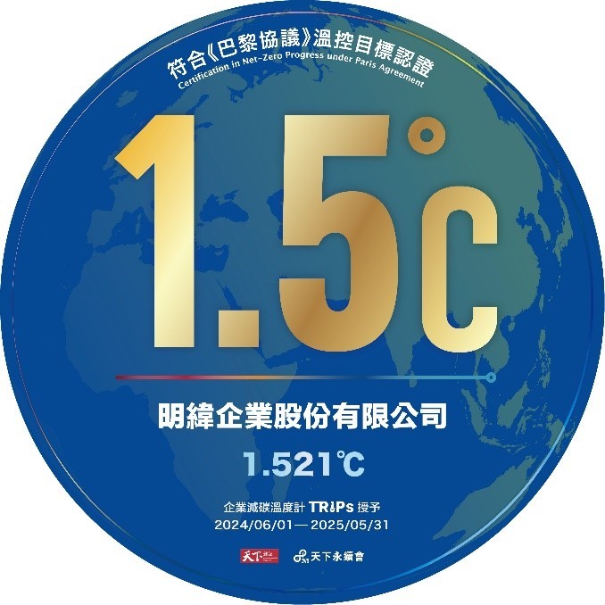 「企業(yè)減碳溫度計(jì)」(Temperature Rising Index for Pathways, TRIPs)由天下雜志與東海大學(xué)企業(yè)永續(xù)影響力中心共同發(fā)布,采用聯(lián)合國(guó)政府間氣候變化專門委員會(huì)(IPCC)發(fā)布之地球升溫情境,將全球升溫潛勢(shì)模型(Absolute Global Temperature Potential, AGTP)應(yīng)用在企業(yè)的溫度評(píng)分。以企業(yè)自定義的減碳與凈零目標(biāo),仿真升溫?cái)?shù)據(jù),即為企業(yè)未來(lái)減排路徑的溫度。明緯經(jīng)此模型推算溫度評(píng)級(jí)為1.521°C,符合于巴黎協(xié)議升溫1.5°C控制目標(biāo),更遠(yuǎn)低于臺(tái)灣制造業(yè)2.79°C的平均溫度評(píng)級(jí)。